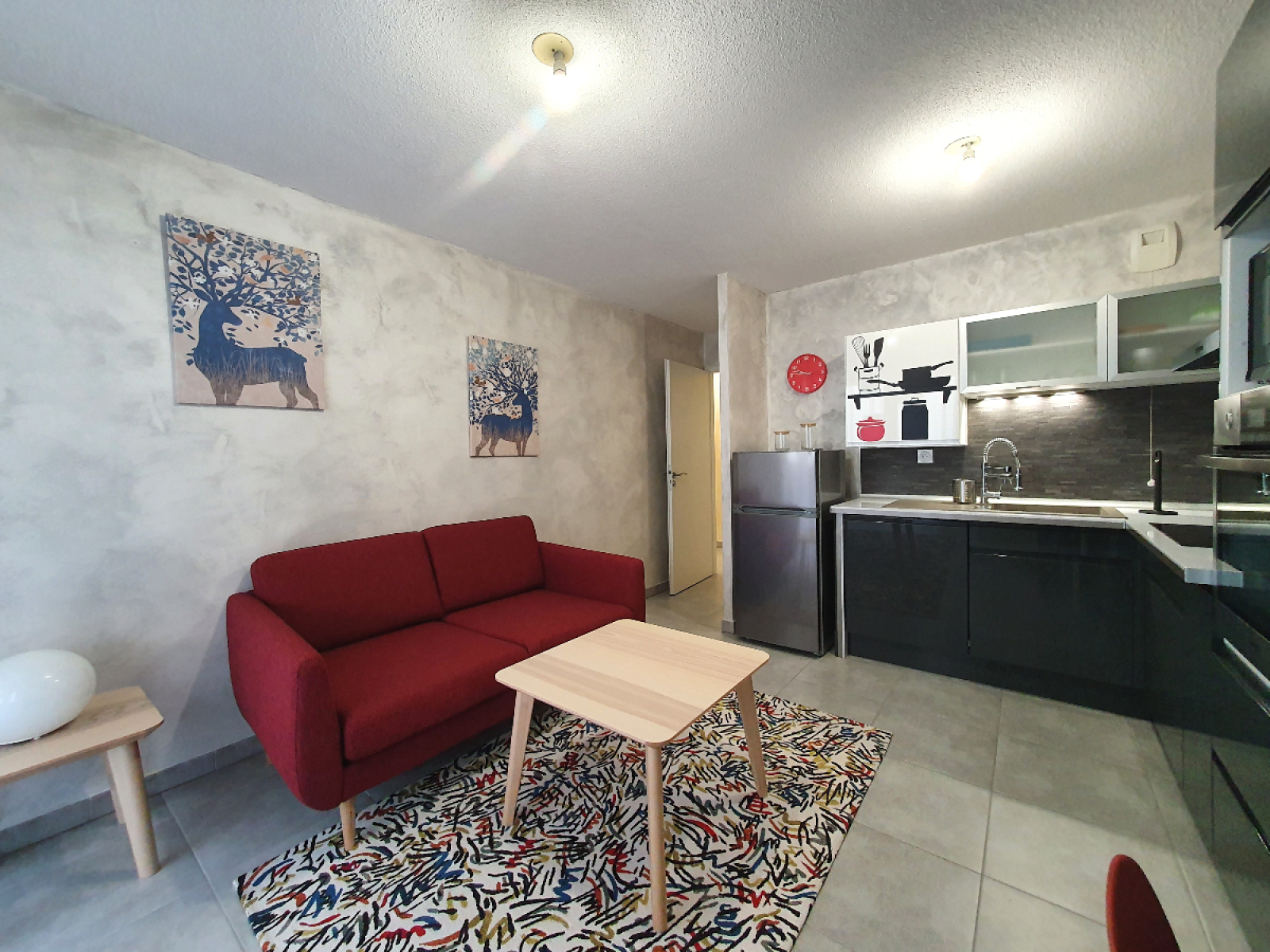 L'appartement se compose d'une entrée, d'un séjour avec cuisine ouverte meublée et équipée, d'une chambre et d'une salle d'eau avec WC. Un grand balcon de près de 9 m² et deux emplacements de parking sous-terrain complètent cet appartement.