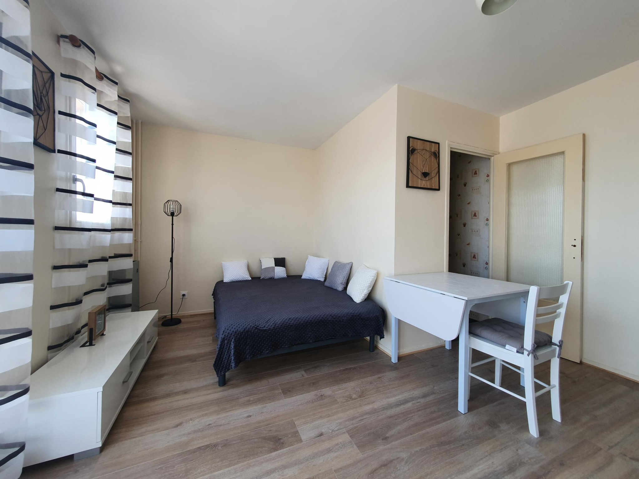 Situé au premier étage avec ascenseur, il se compose d'une entrée avec placard, une salle de bains avec WC, une pièce principale et d'une petite cuisine séparée. Un emplacement de parking privatif est rattaché à cet appartement, et la copropriété dispose d'un local vélo.