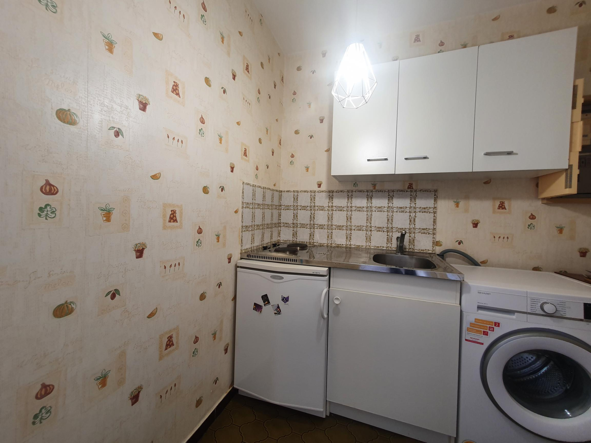 Lino, Peinture, Faïence Kitchenette avec plaques électriques et évier inox et réfrigérateur top Branchement machine à laver