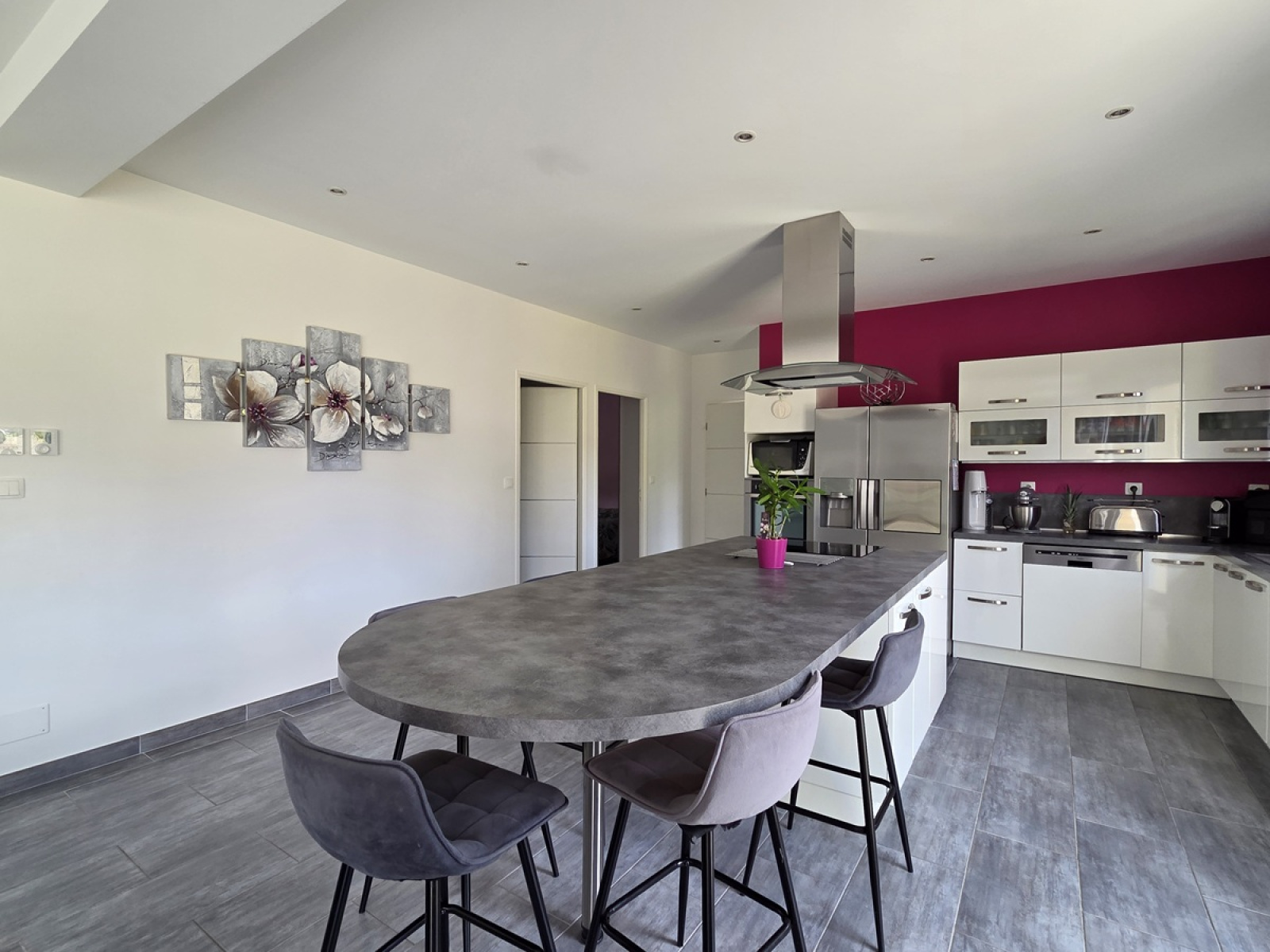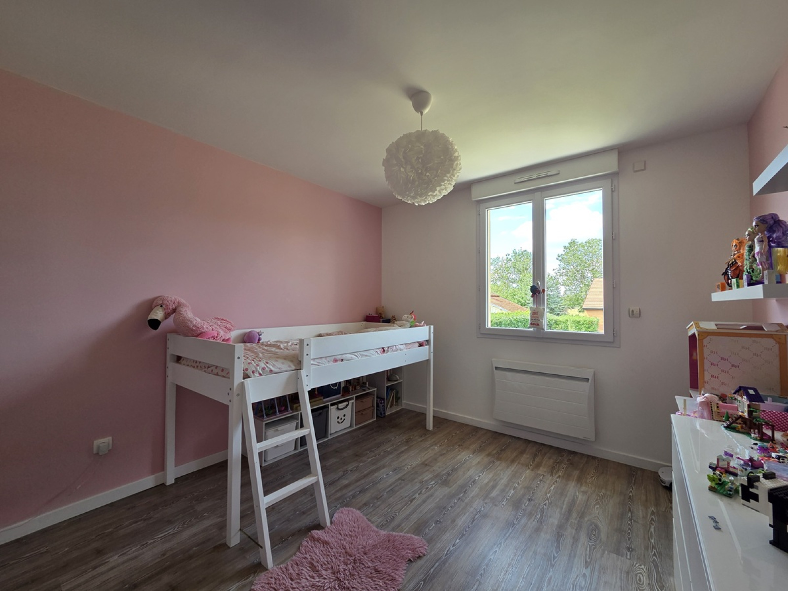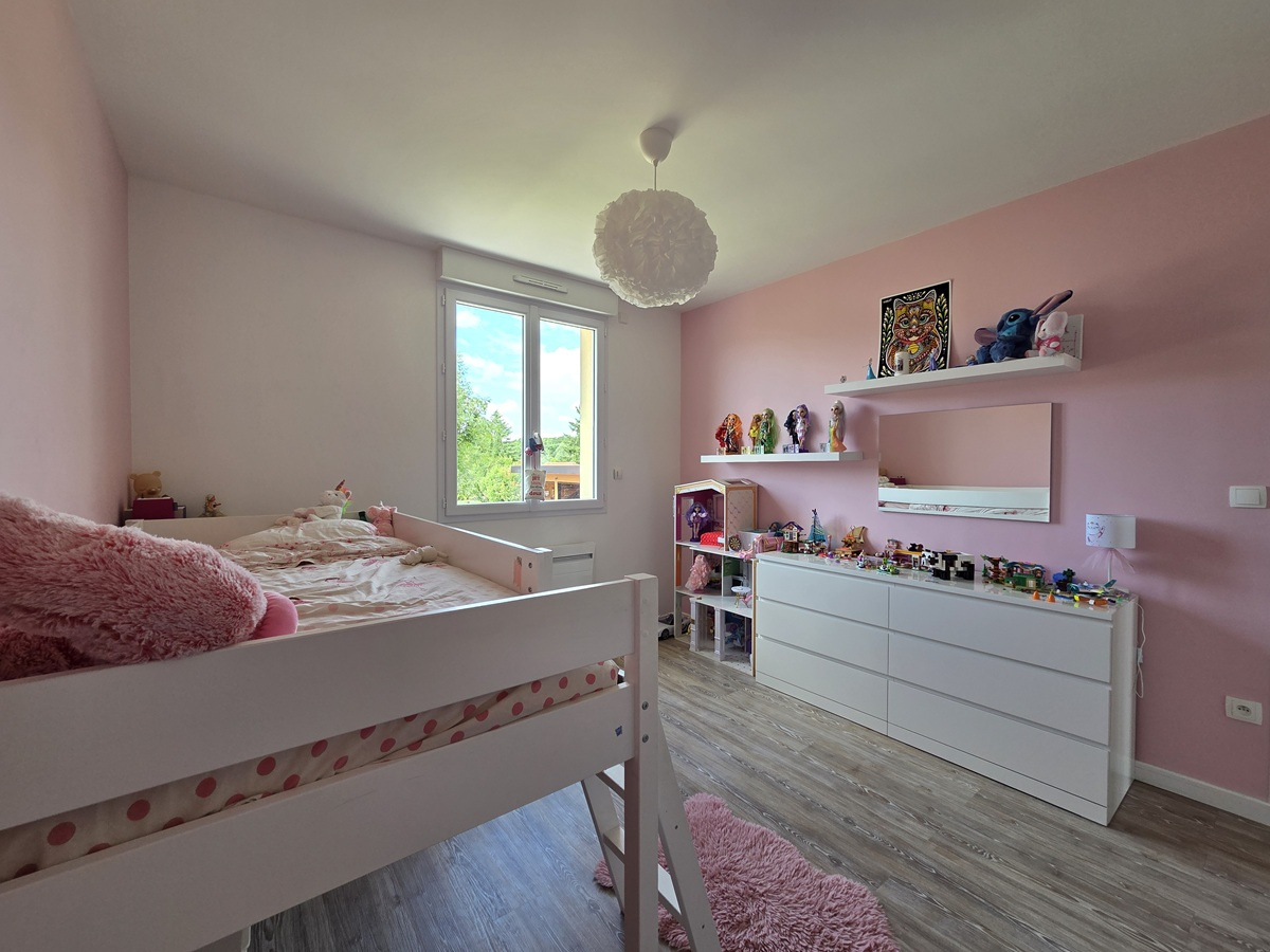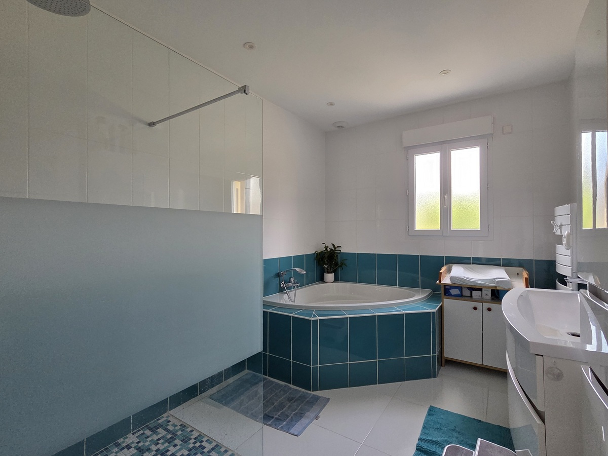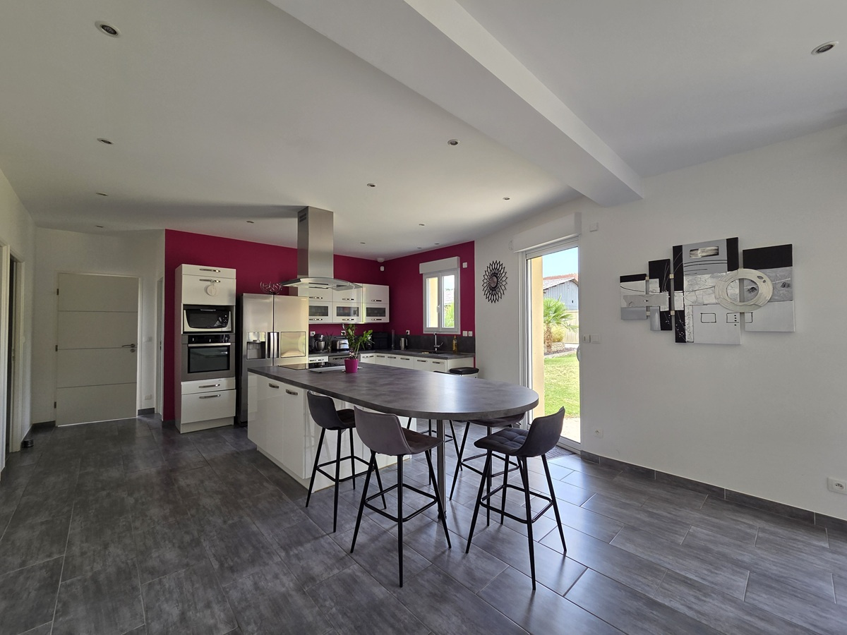 Une immense pièce de vie de plus de 80m² avec grand espace cuisine complètement aménagé et équipé, baies coulissantes donnant sur la terrasse, deux chambres spacieuses de 14m² chacune, salle de bains (baignoire + douche), wc, dégagement, buanderie, cellier, garage.